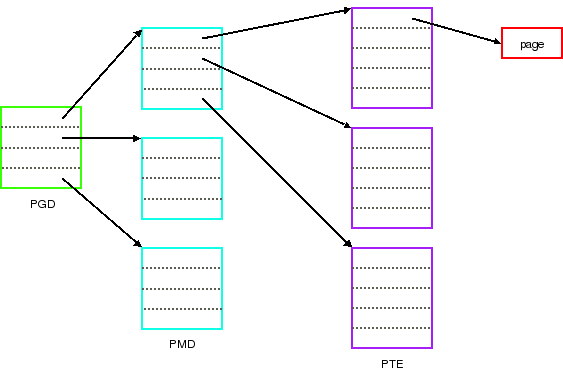 in 2.6.11, the page table structure will include a new level, called "PUD," placed immediately below the top-level PGD directory. The new page table structure looks like this: